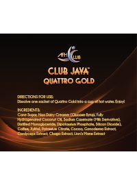 QUATTRO GOLD is comprised of exotic coffee beans blended with Ganoderma, Cordyceps, Chaga, and Lion's Mane extracts for optimum health benefits. Lightly flavored with cocoa, organic cane sugar, xylitol, and non-dairy creamer, it provides a delightfully sophisticated cup anytime of day